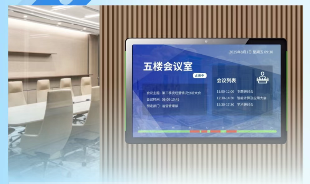 具备“会议信息显示、人脸签到、视频播放”等功能,是智慧空间的重要成员。基于用户使用需求,可搭配空间物联集控系统化身中控屏;可搭配会议管理系统,化身会议预约信息展示、人脸签到屏;也可搭配信息发布系统,成为宣传屏。一屏多用,一屏掌控。